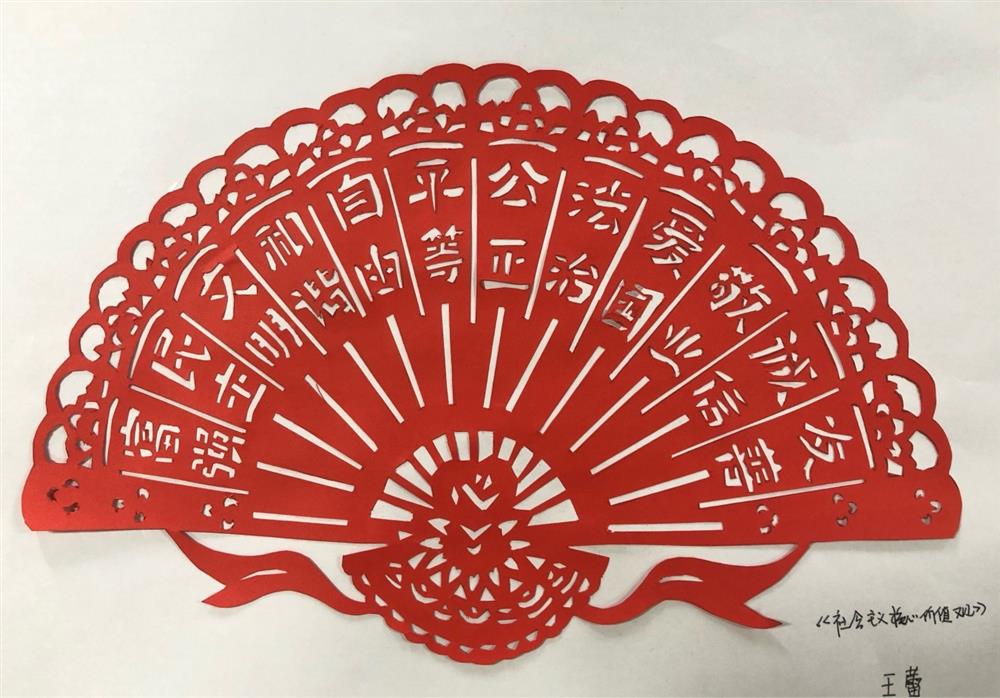 园区投资公司王蕾的作品《社会主义核心价值观》获得二等奖,作者以紧密有致的扇形设计将社会主义核心价值观这个主题巧妙的呈现,作品画面均衡、线条流畅,美观大方,有较高的艺术性和观赏性。